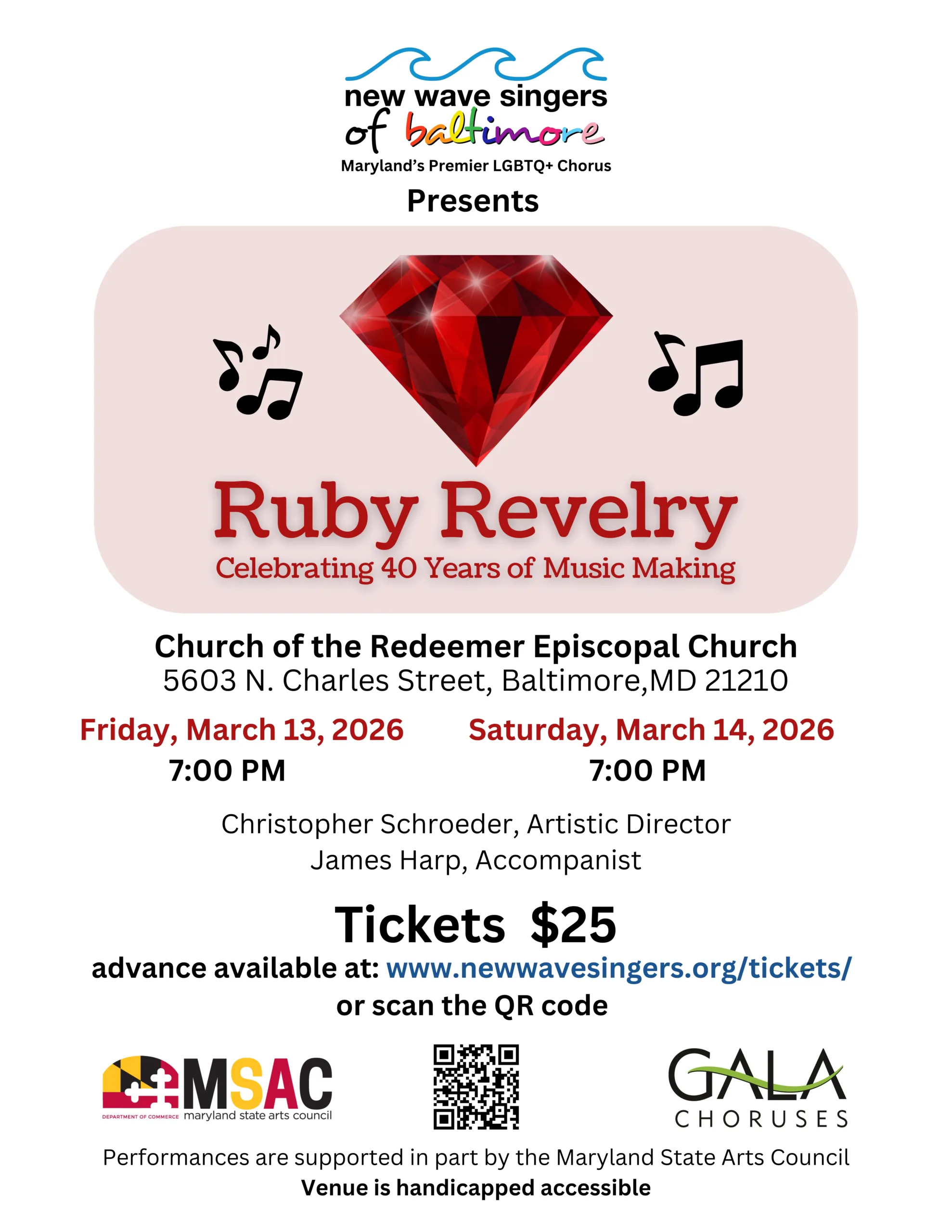 Join the New Wave Singers of Baltimore as we present our Spring showcase performance, Ruby Revelry: Celebrating 40 Years of Music Making.